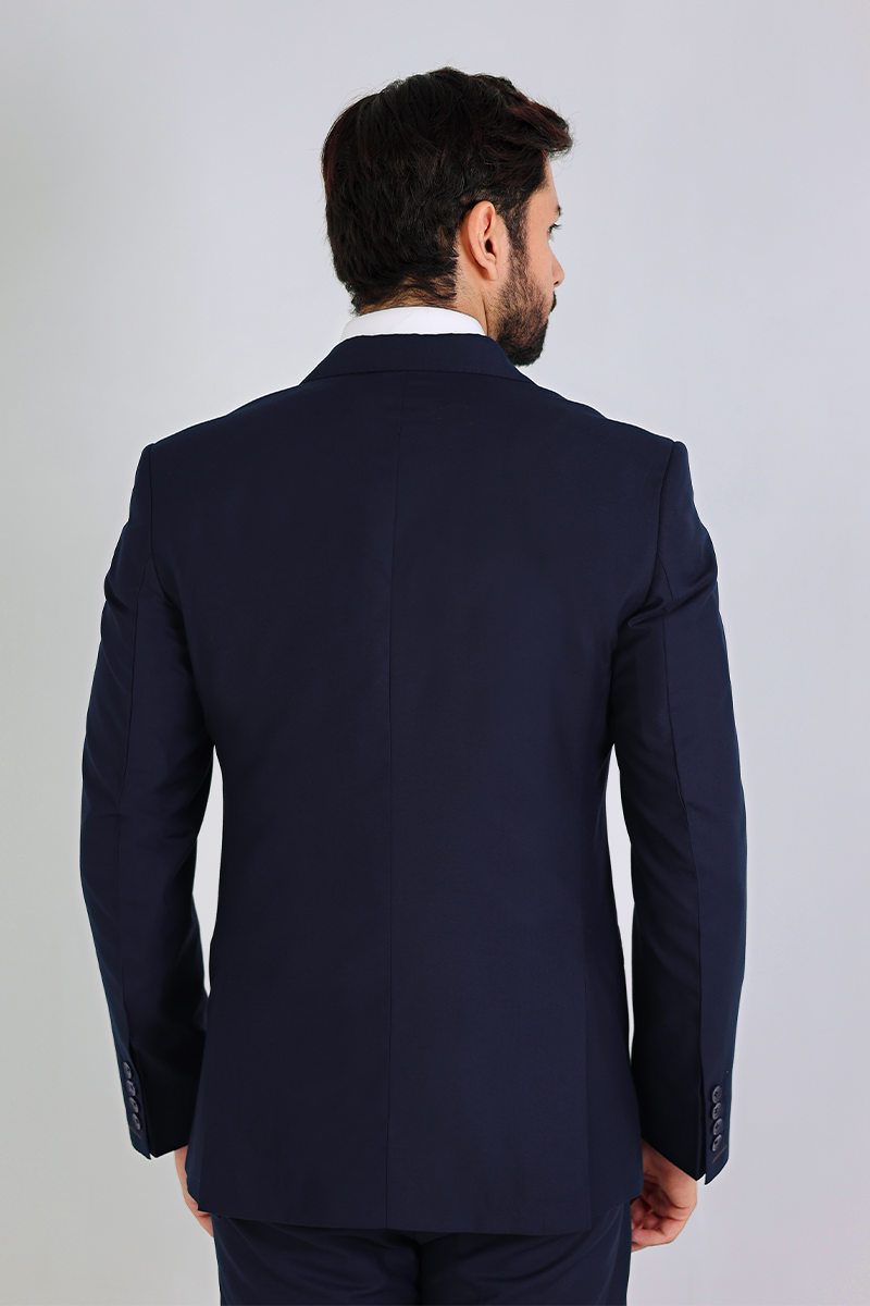 Navy Blue The Carmello three-piece suit in navy blue is designed for men who favor precision and presence. Cut from a fine cotton wool blend, the single-breasted jacket features a notch lapel with a non-functional buttonhole, two-button front closure, four sleeve buttons with a signature unfinished detail on the last hole, curve wallet pocket, flap pockets, hem stitches, and a rounded bottom for a fluid finish.