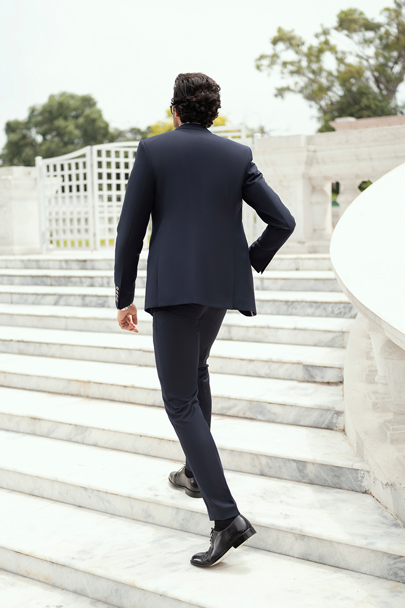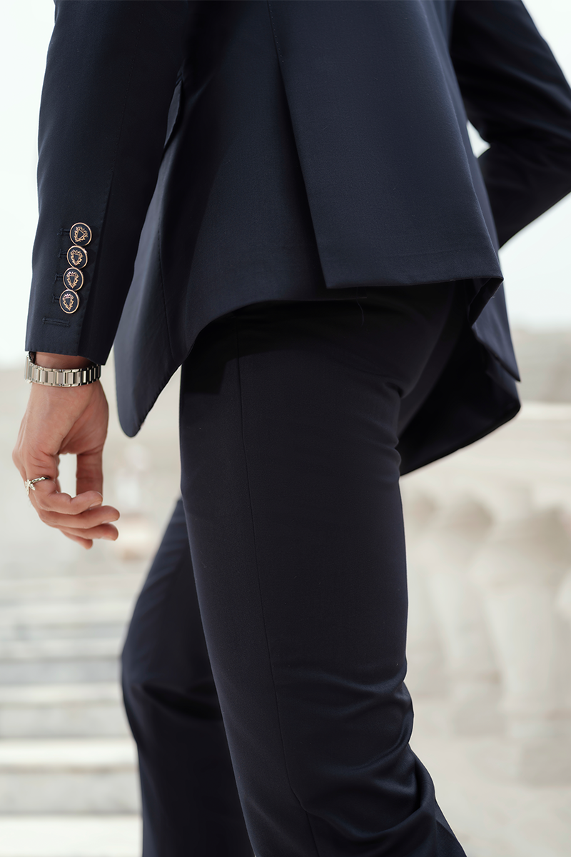 Commanding in presence yet fluid in detail, the Nero suit is composed in an ink blue cotton wool blend with a single-breasted profile. Its peak lapel, double-button front, and precisely finished hem stitches frame a design made for distinction. The curve wallet pocket and lower flap pockets add a tailored rhythm, while the rounded bottom eases structure with subtle flair.
