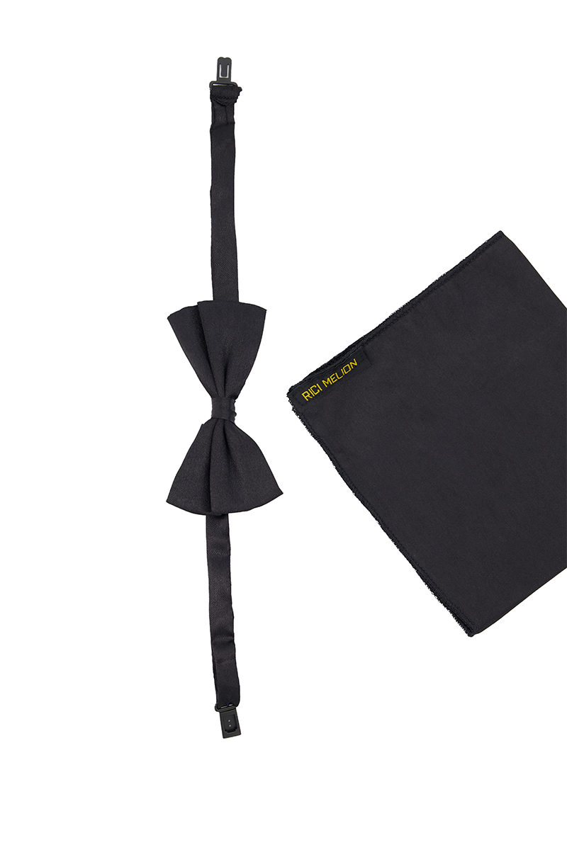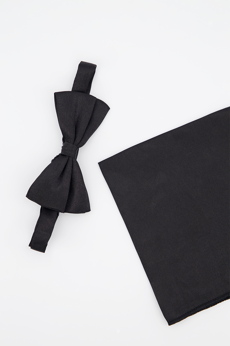 Opluxe in Black captures the essence of formal grandeur through its seamless pairing of a satin bow tie and pocket square. Crafted in a lustrous jet-black tone, this duo embodies depth, precision, and a timeless charm that enhances every formal ensemble.
