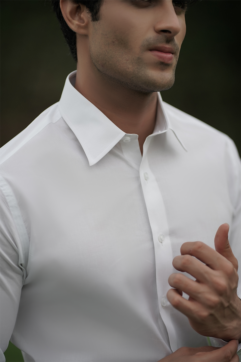 A refined staple in crisp white cotton, Galan is tailored with a semi-spread collar and sport front for a composed, modern profile. The angled cuffs with twin buttons and a rounded hem finish the design with clean precision. Ideal for understated formal dressing with enduring appeal.