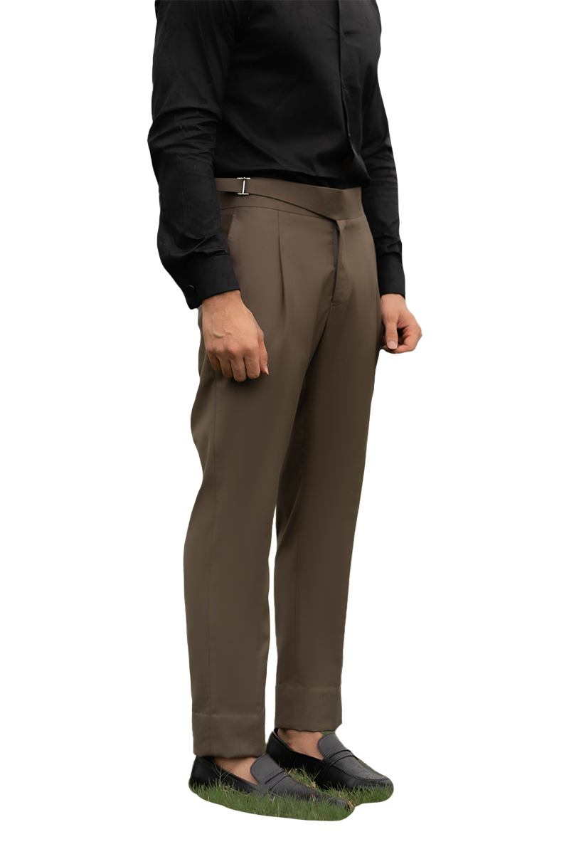 Ruprt in olive merges traditional structure with practical detail. Crafted from a cotton-wool blend, the trouser features a wide waistband, adjustable side straps with buckles, cross pockets, and a single pleat—designed for a clean, versatile fit. The rich olive tone adds depth to understated formalwear.