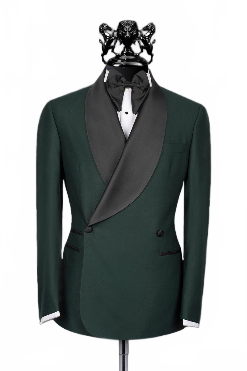 An ideal selection tailored to your preferences: Our Premium Edition Livorno Two Piece Suit boasts a striking Bottle Green Italian fabric . This ensemble features a double-breasted jacket with a single button closure, jetted pockets adorned with a satin shawl lapel and paired with a slim-fit trouser. The seamless integration of the black satin lapel and the distinctive color of the fabric imbues the suit with a touch of individuality, rendering it suitable for formal events or elevating your daily wardrobe with a dash of sophistication.