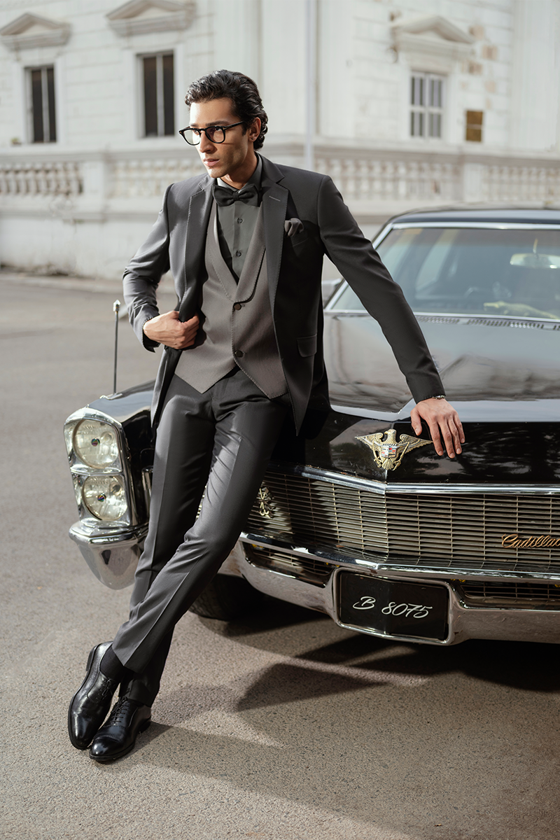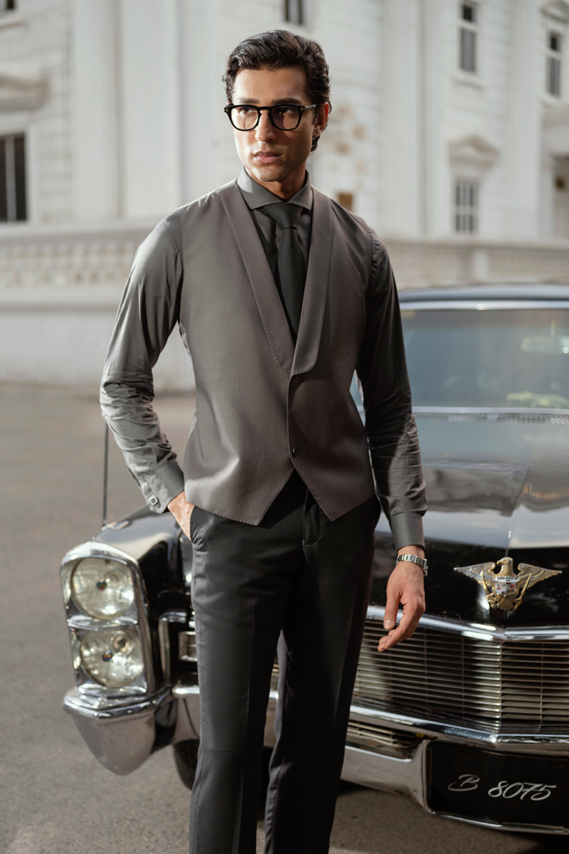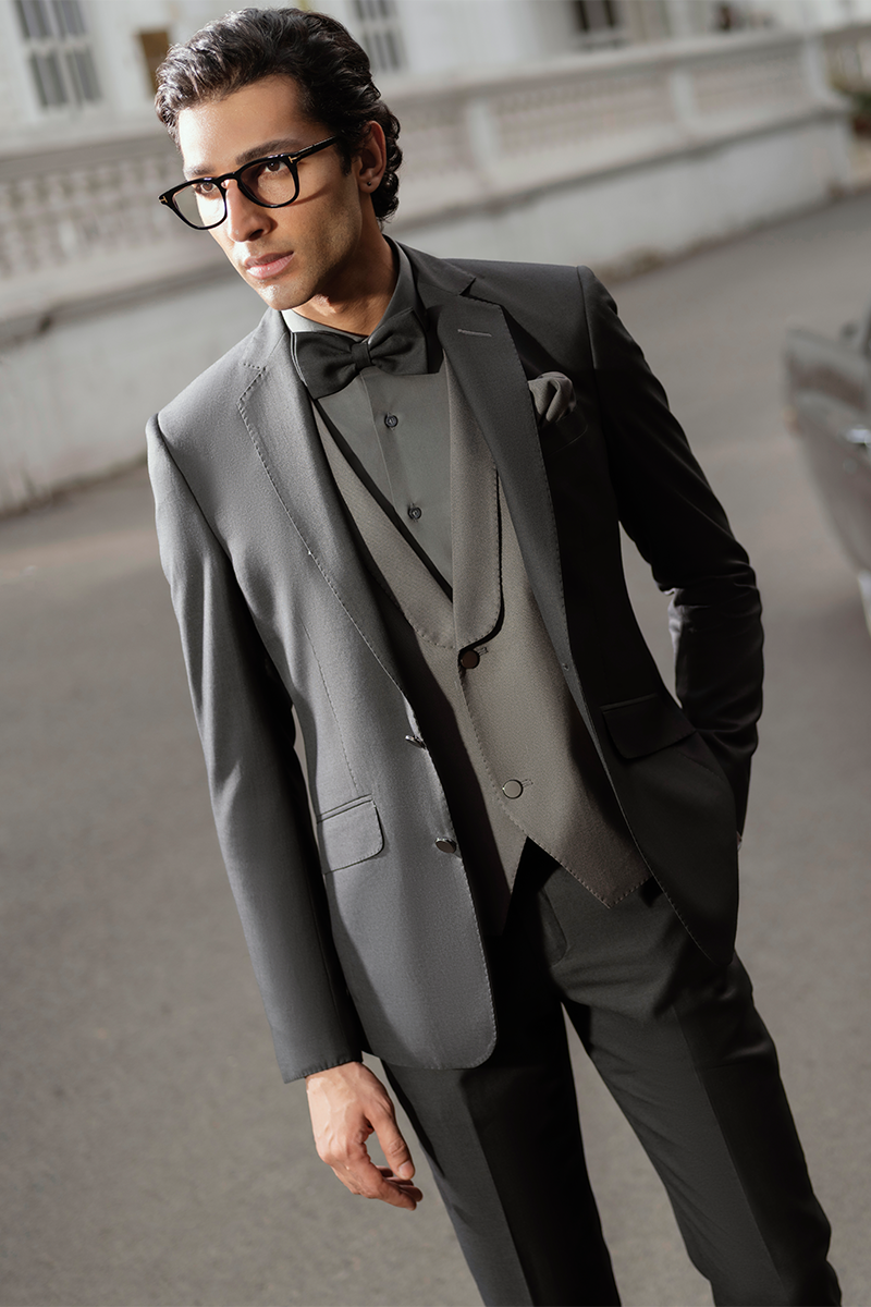 The trousers follow with a slim-fit silhouette, shaped in the same fabric and hue, featuring cross pockets and a standard waistband that sharpens the overall proportion. Completing the trio, the waistcoat contrasts in dotted wool, presenting a single-breasted front with two buttons, a smooth shawl lapel, and a W-bottom cut that lends a striking finish.