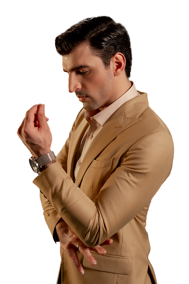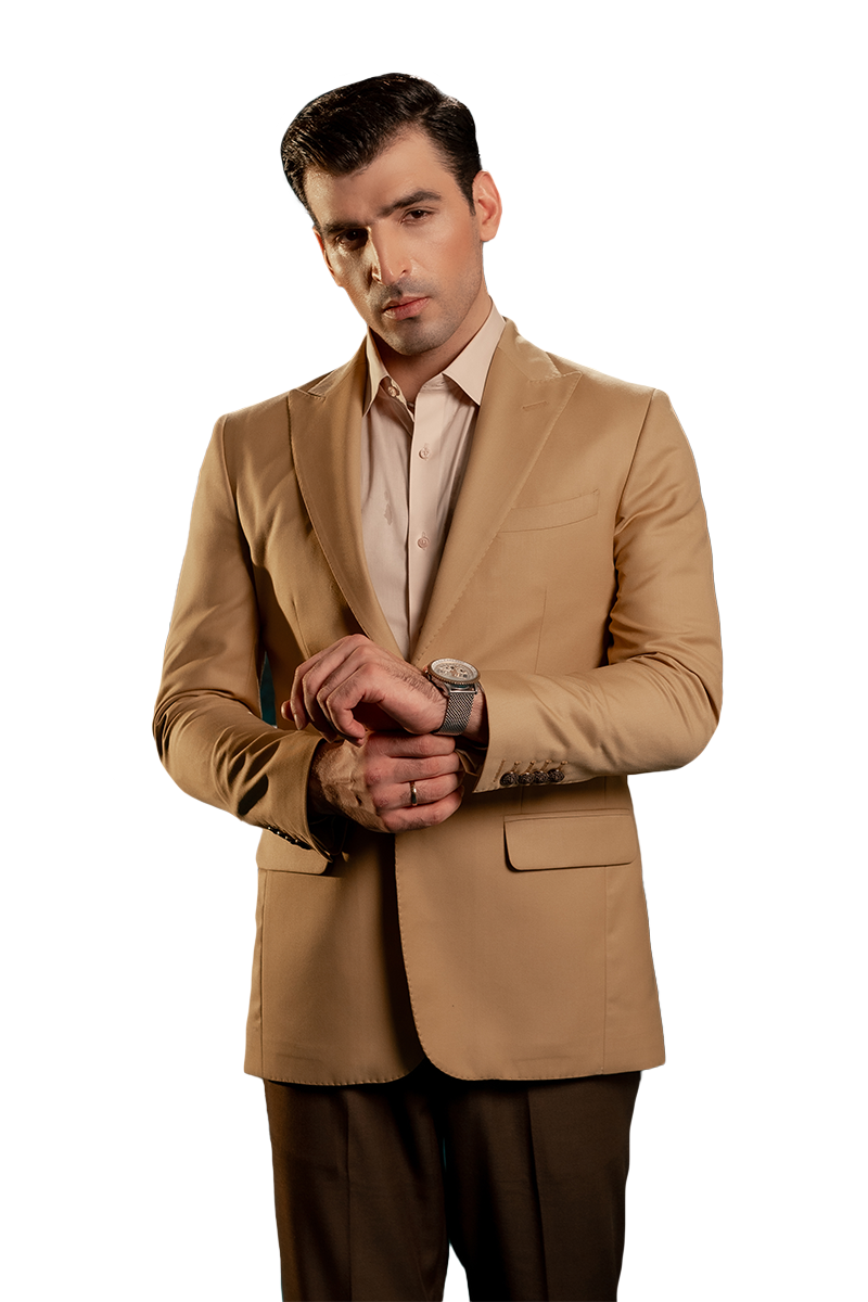 Introducing Adriel: a modern khaki blazer that redefines classic style. This standout piece features a sharp peak lapel and two brass buttons for a touch of refined elegance. With its curved wallet pocket and flap pockets, Adriel combines practicality with chic design. Four buttons on the sleeves and hem stitches on the lapel and front bottom complete the look, adding intricate detailing. Perfect for both formal and smart-casual occasions, Adriel ensures you make a distinguished impression every time.
