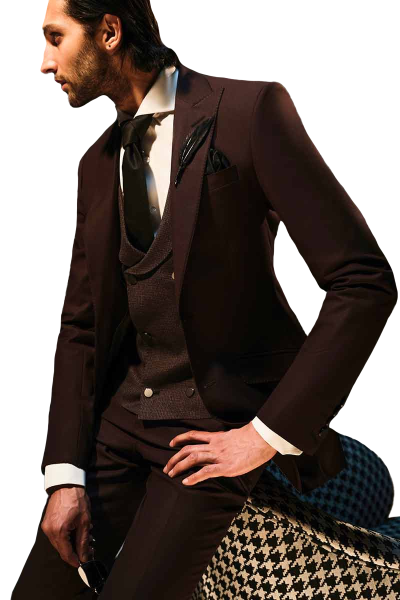 The rich chocolate brown jacket is the centerpiece of this outfit. The tailored fit flatters and exudes confidence. The matching double-breasted waistcoat adds elegance to this suit. The double-breasted design is elegant and harmonious. A slanted buttonhole highlights the jacket's intricate detailing and expert craftsmanship.