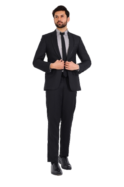 The Inizio suit is tailored from a cotton-wool blend in rich black, designed to carry a sleek and composed presence. Its single-breasted blazer features a shawl lapel finished with satin piping, secured at the front with two satin-covered buttons. Four sleeve buttons complete the sleeves, with the last buttonhole intentionally non-functional for design precision. A curve wallet pocket, lower flap pockets, overall hem stitches, and a rounded bottom add balance to its structure.