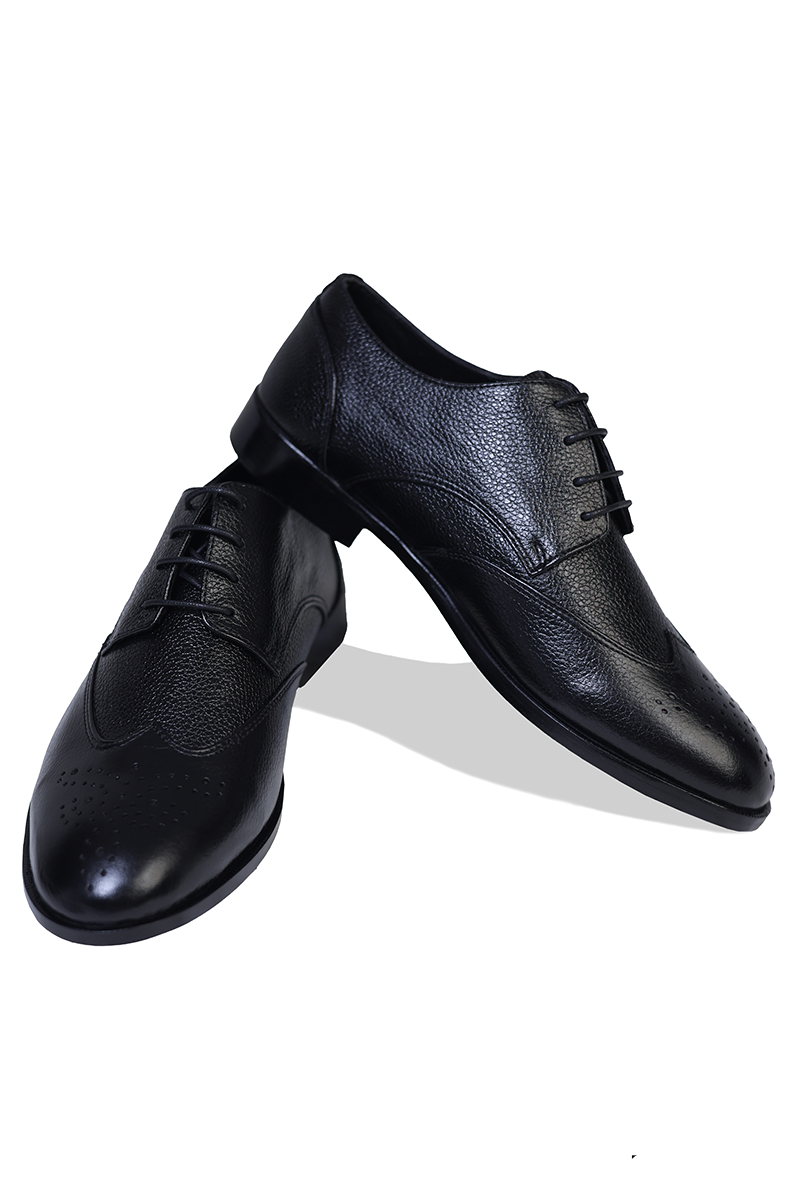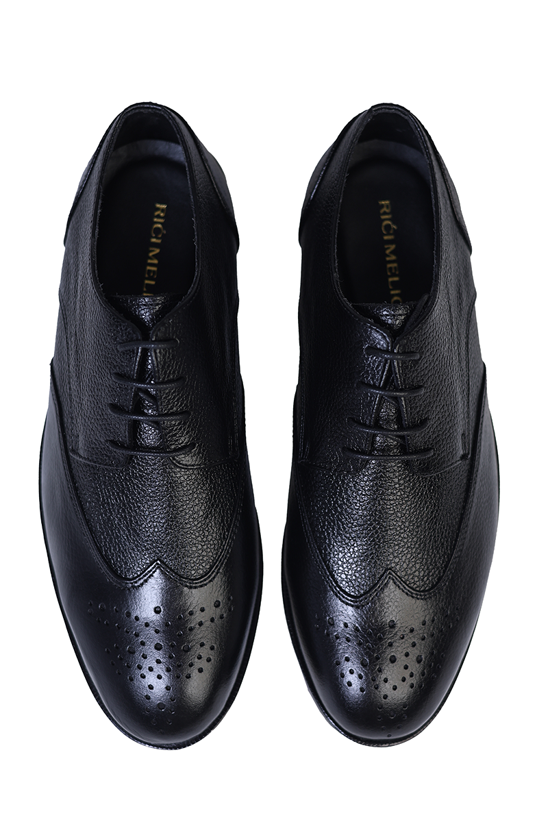 The Chinyere shoes in black textured leather bring depth and authority to the timeless Oxford silhouette. Their closed lacing and smooth toe finish create a sharp, composed profile, while the cushioned inner pad ensures ease with every step. A leather upper polished to perfection gives them a refined edge, making them a definitive choice for men who prefer formality with presence.