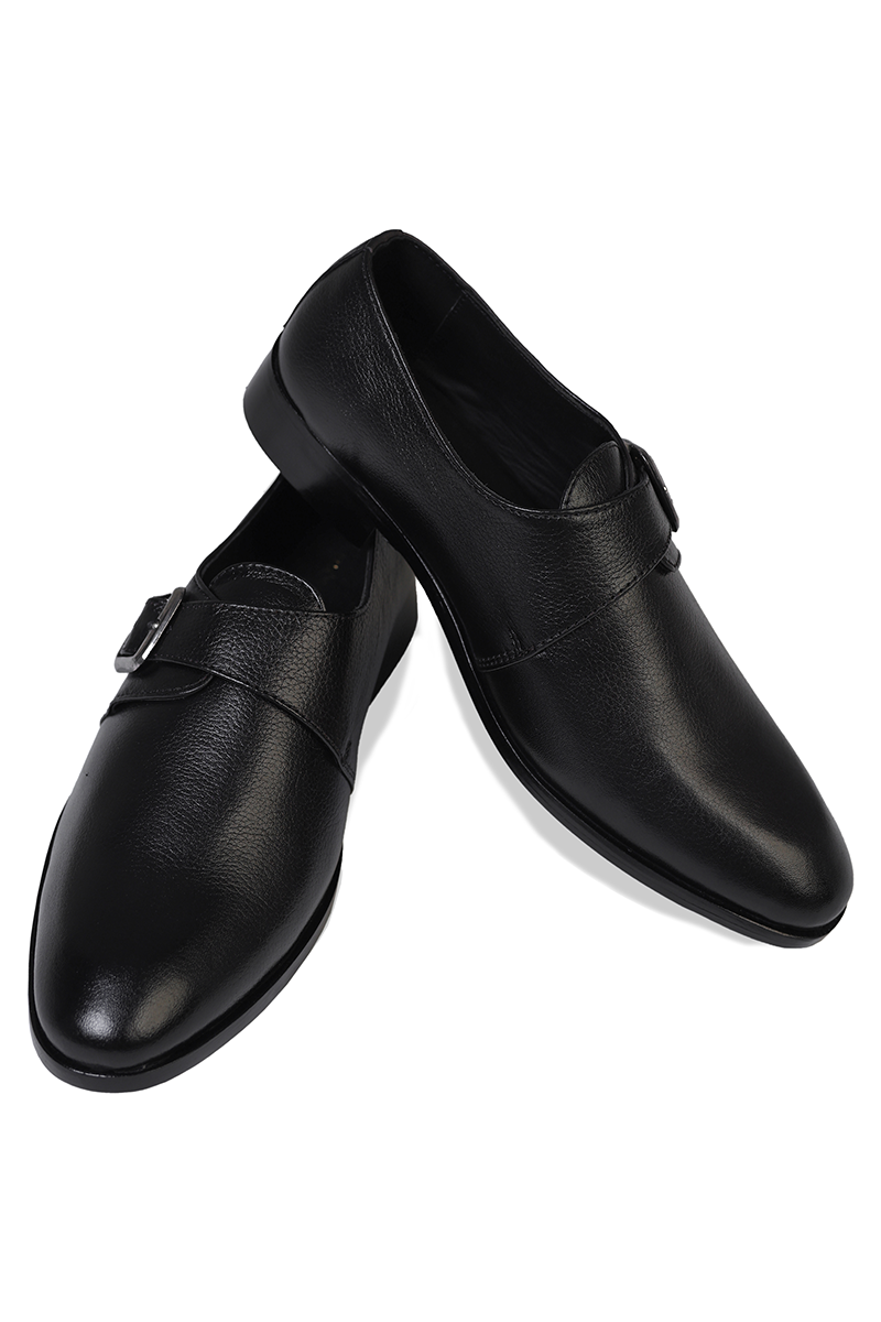 Bold in presence yet refined in structure, the ONYINYECH single monk shoes in pure black leather carry an unmistakable charm. Designed with a sleek strap and buckle closure, the pair brings an edge of authority to every stride. The supple leather wraps the foot with ease, while the soft inner pad ensures day-long comfort.  Resting on a polished wooden leather sole, these Italian-inspired shoes strike the perfect chord between style and function. A choice made for those who value sharp detail and unwavering character, ONYINYECH is more than footwear — it’s the seal of distinction every formal wardrobe craves.
