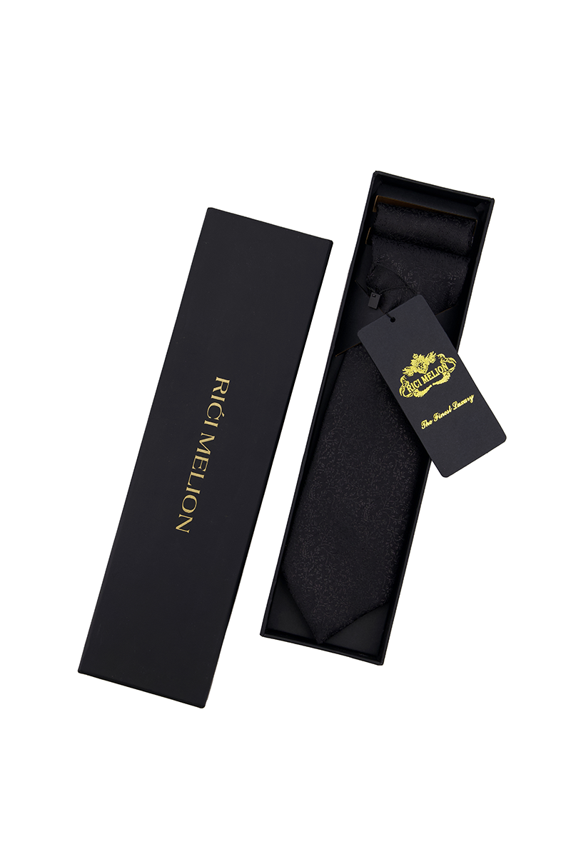Safora in Black redefines formal grace with its satin tie and pocket square set, woven in a subtle textured pattern that adds quiet depth to its sleek tone. The tie, tailored in a standard width with a smooth, fluid drape, carries a sense of assured confidence.