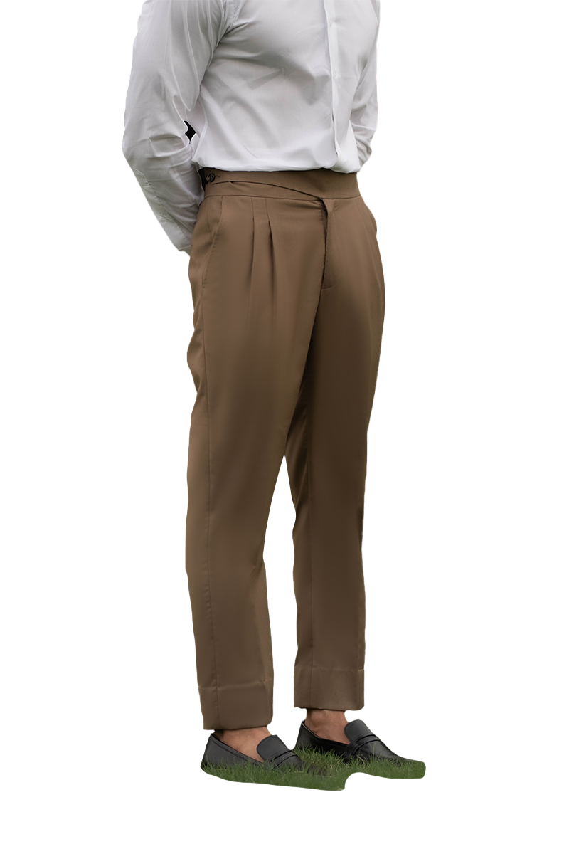 A confluence of heritage and functionality, the Ruben pants in brown are cut from a refined cotton-wool blend for tactile richness and lasting form. Featuring a double-pleated front with a high-rise Gurkha waistband, this design pays homage to classic menswear while embracing modern ease. The adjustable side buttons, cross pockets, and regular bottom ensure balance between structure and movement—delivering timeless intent through every considered detail.