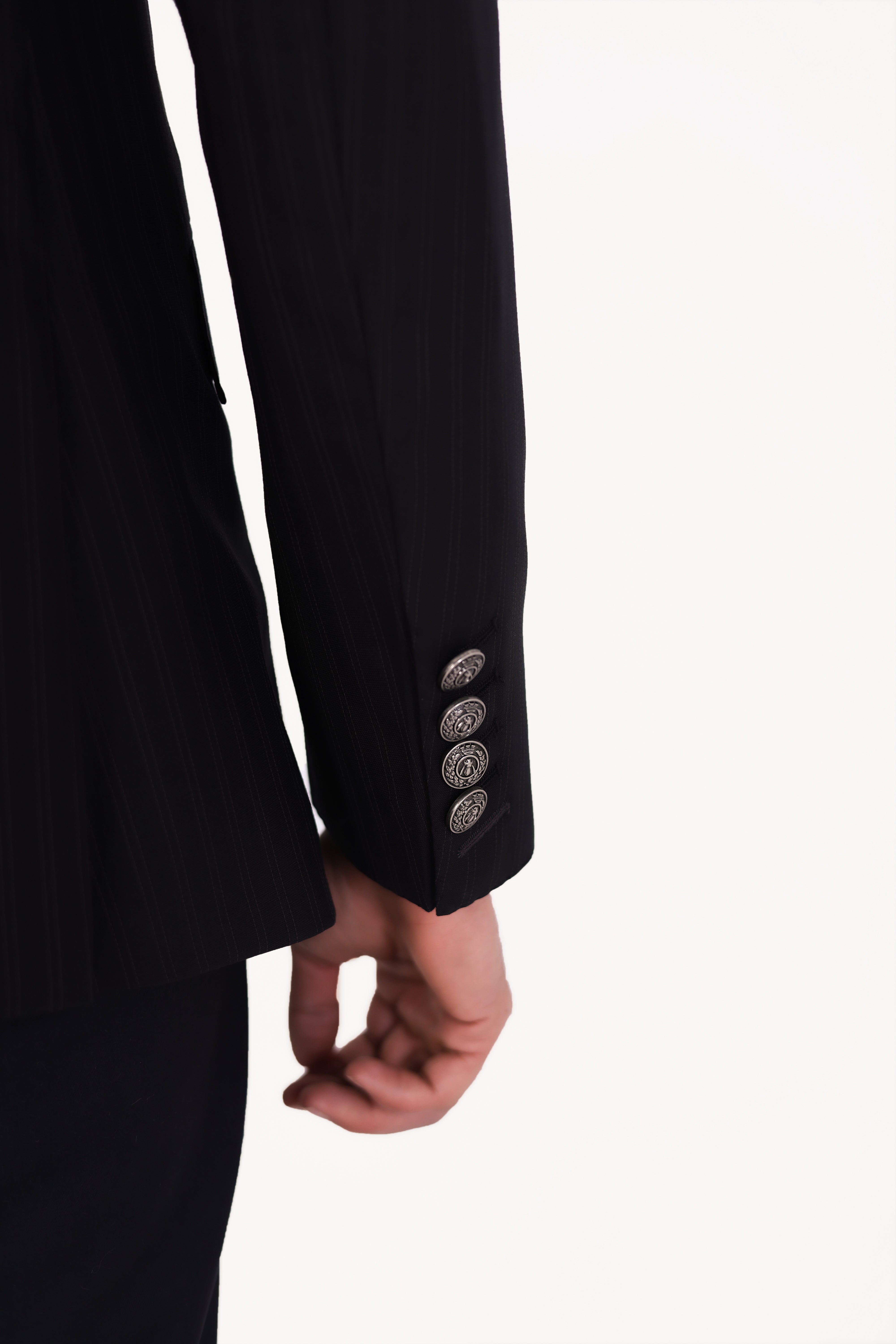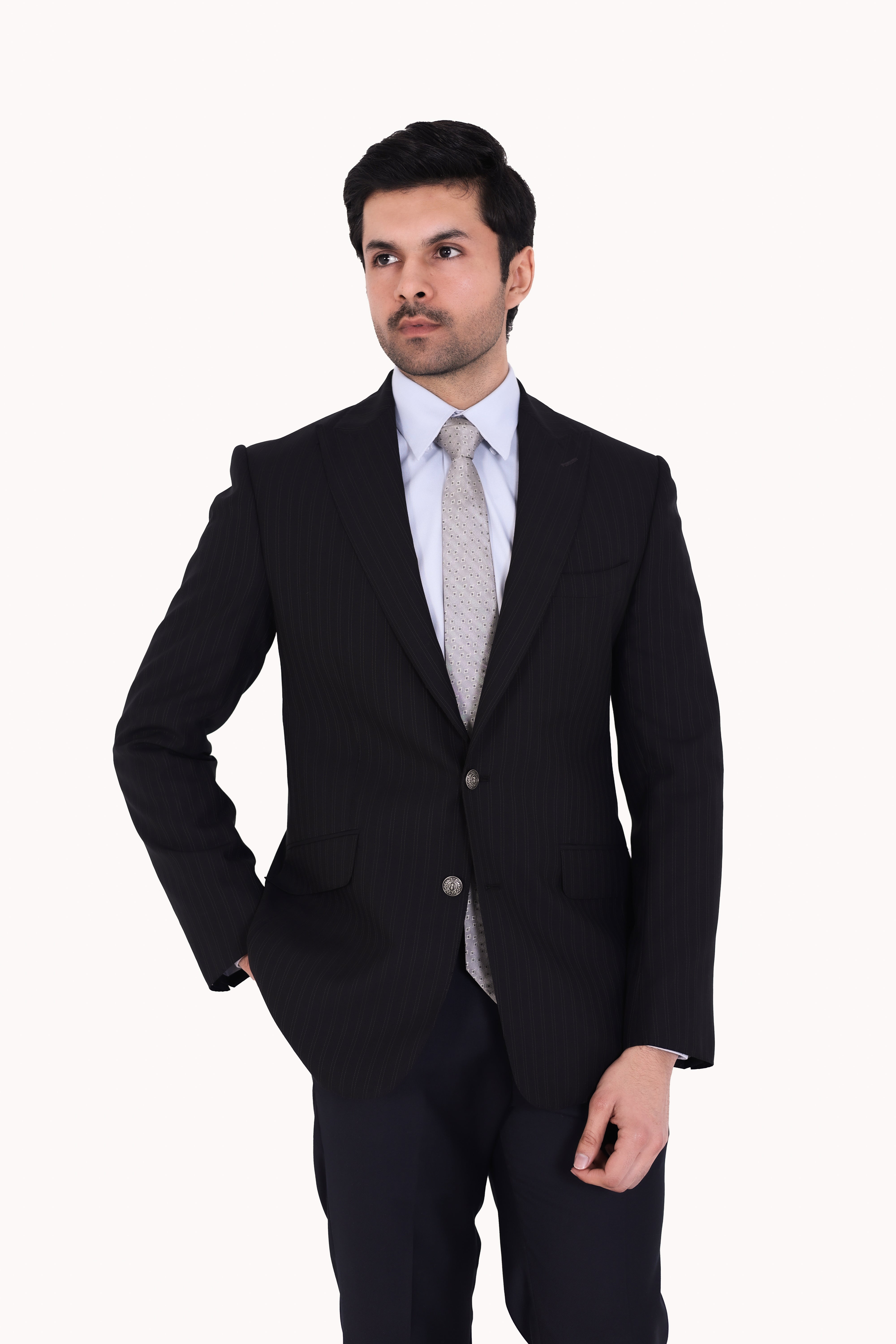 Designed with a sharp peak lapel, two front metal buttons, and a stylish curved welt pocket.