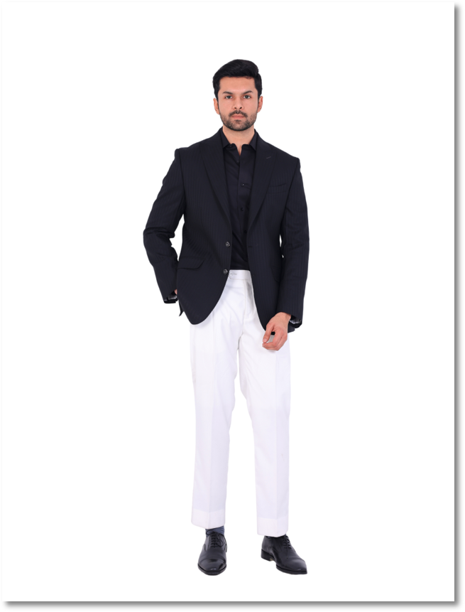 Command attention with this classic black single-breasted blazer. Tailored with a sharp peak lapel and two front button closure, it creates a strong and refined silhouette. The curved pockets with dropped angle detailing add a subtle contemporary finish. Double vents and a round hem ensure comfort, flexibility, and clean structure. A timeless essential designed for powerful, polished styling.