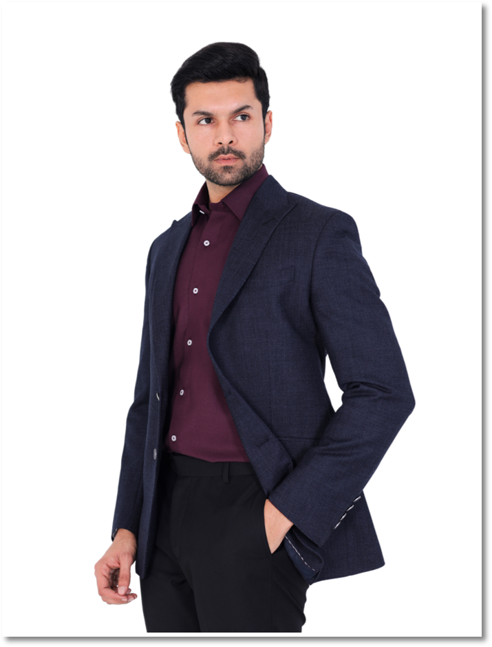 Make a bold statement with this deep blue single-breasted coat. Designed with a sharp peak lapel and two front button closure, it delivers a powerful, tailored silhouette. The curved pockets with dropped angle detailing add a refined modern touch. Double vents and a round hem enhance comfort and movement without compromising structure. A timeless piece crafted for confident, elevated style.