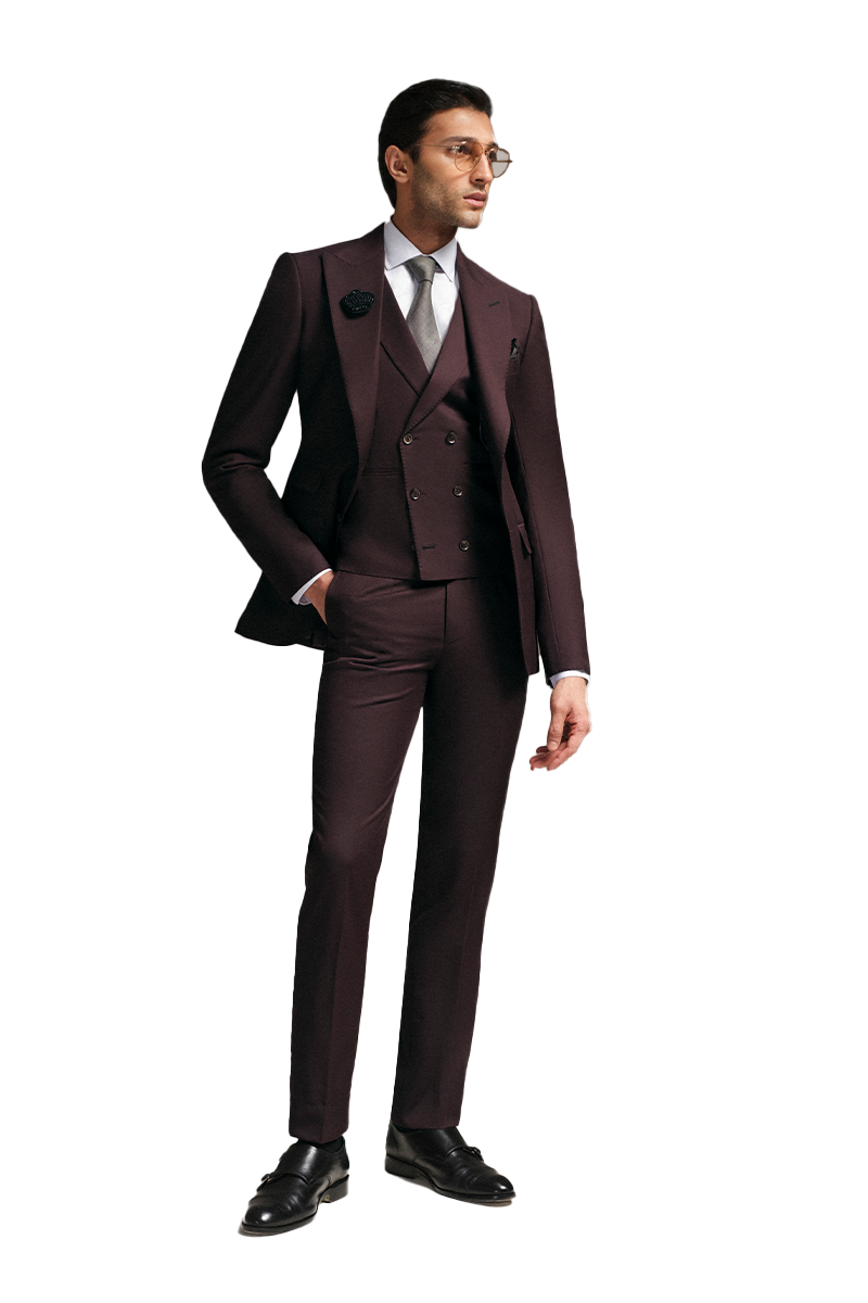 Exuding a bold character, this burgundy Ambrose Three Piece Suit features a peak lapel, a sharp 2-button closure, and a curved wallet pocket, accompanied by flap and ticket pockets. Its 4-button sleeves and non-functional buttonholes on the lapel and sleeves add subtle finishing touches. Hem stitches accentuate the lapel, front, pocket flaps, and side panels, offering a finely detailed structure from front darts to the back seam. Paired with a doublebreasted waistcoat, adorned with a 6-button layout, straight bottom, bone pockets, and meticulously hem-stitched edges, this suit embodies tailored craftsmanship for those who appreciate standout formalwear.