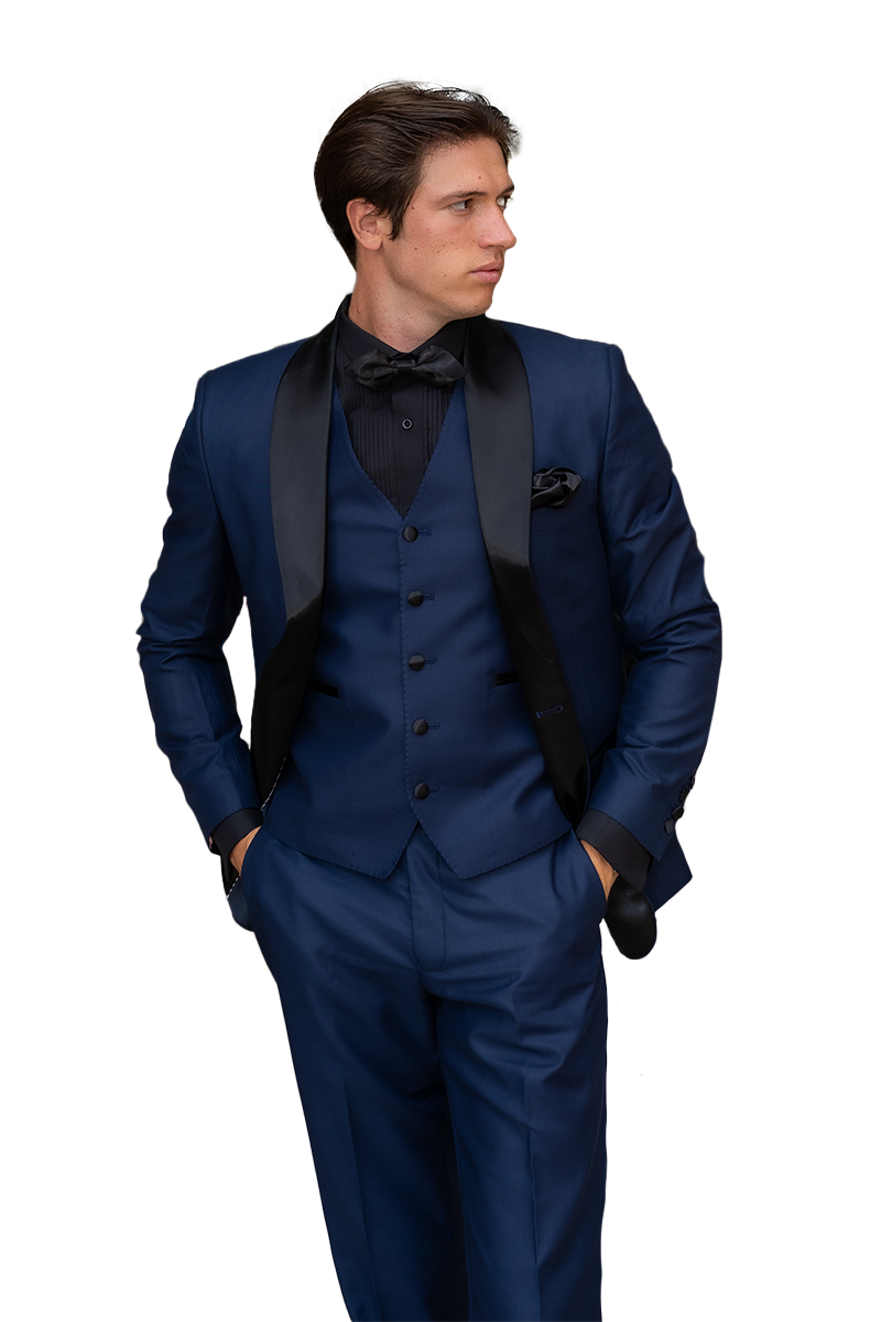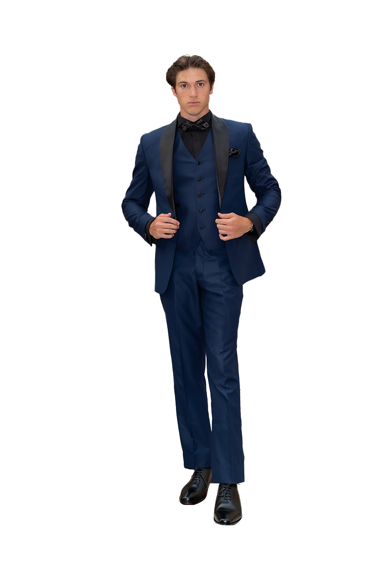 The Conall suit in navy blue brings together a bold structure and refined details. Designed with a box-cut shawl lapel featuring a satin finish, it presents a smooth and sleek contrast. The one-button front closure, curve wallet pocket, and straight-angled flap pockets add a streamlined touch, while the rounded front bottom enhances its distinct silhouette.