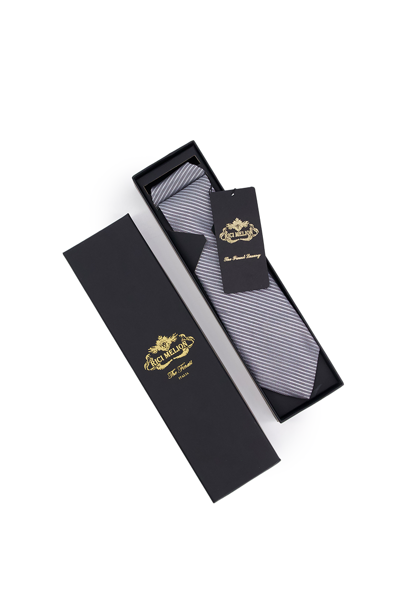The VALERIO tie in grey redefines understated charm with its suiting fabric, subtly enriched by charcoal grey lines. Accompanied by a matching pocket square and encased in an exclusive box, it’s the ideal choice for a refined look.